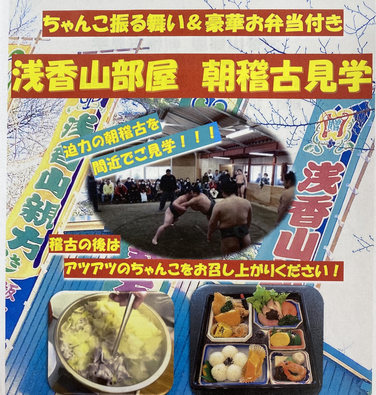 迫力の朝稽古を間近でご見学!!稽古見学の後はお弁当とアツアツのちゃんこをお楽しみください!!!